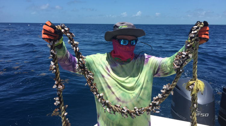 Florida Keys National Marine Sanctuary buoy team member Brady Booton holds a pick-up line compromised by gooseneck barnacles. Prior to the Independence Day weekend, NOAA …
