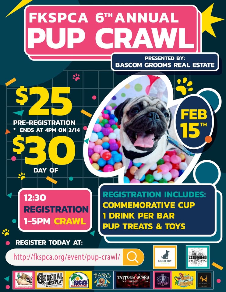 <p>Our 6th annual Pup Crawl is back and this year our Presenting Sponsor is Bascom Grooms Real Estate! Join us Saturday, February 15th at 12:30pm to benefit the animals of the Florida Keys SPCA! This is sure to be a day you and your dog don’t want to miss! Thanks to our Vodka sponsor Good Boy Vodka and our Beer sponsor Cayo Hueso Brewing for your included drinks on the crawl!</p>