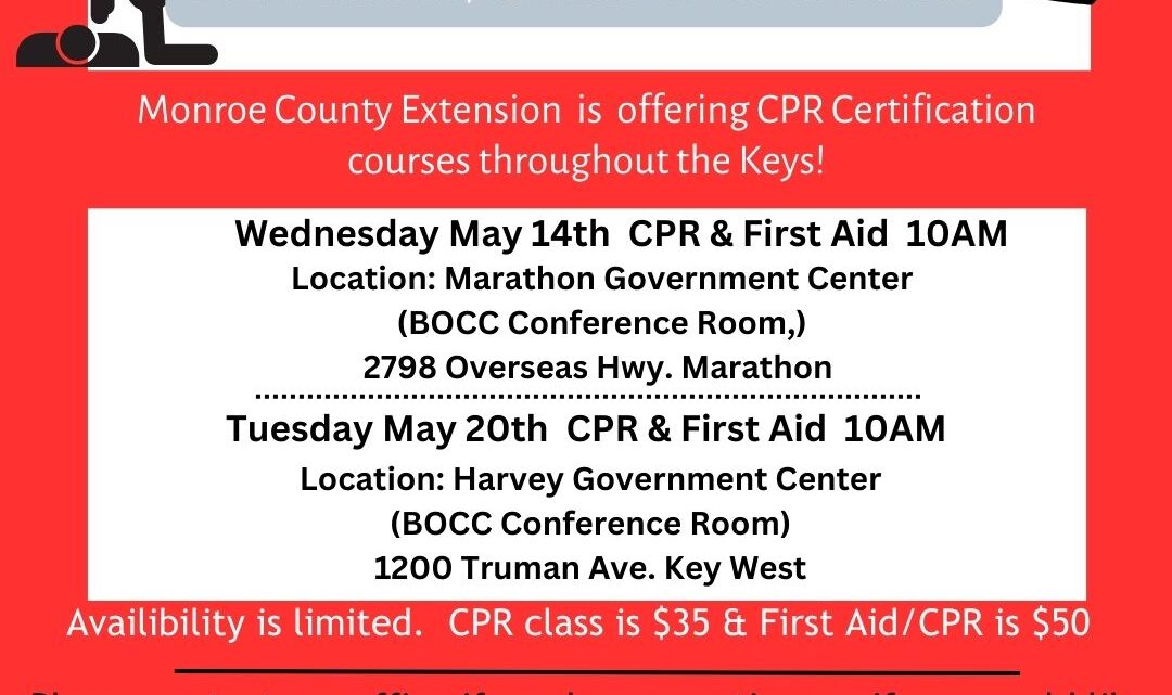 Monroe County News UF/IFAS Extension Monroe County Offers American Heart Association CPR & First Aid Certification Courses Throughout the Keys in May SHARE ON: KONK Life Editor — April 27, 2025 UF/IFAS Extension Monroe County Offers American Heart Association CPR & First Aid Certification Already a subscriber? log in. This story is free for you Create a free account and get more of KonkLife's top stories directly to your inbox. Email Password Or, subscribe for unlimited access